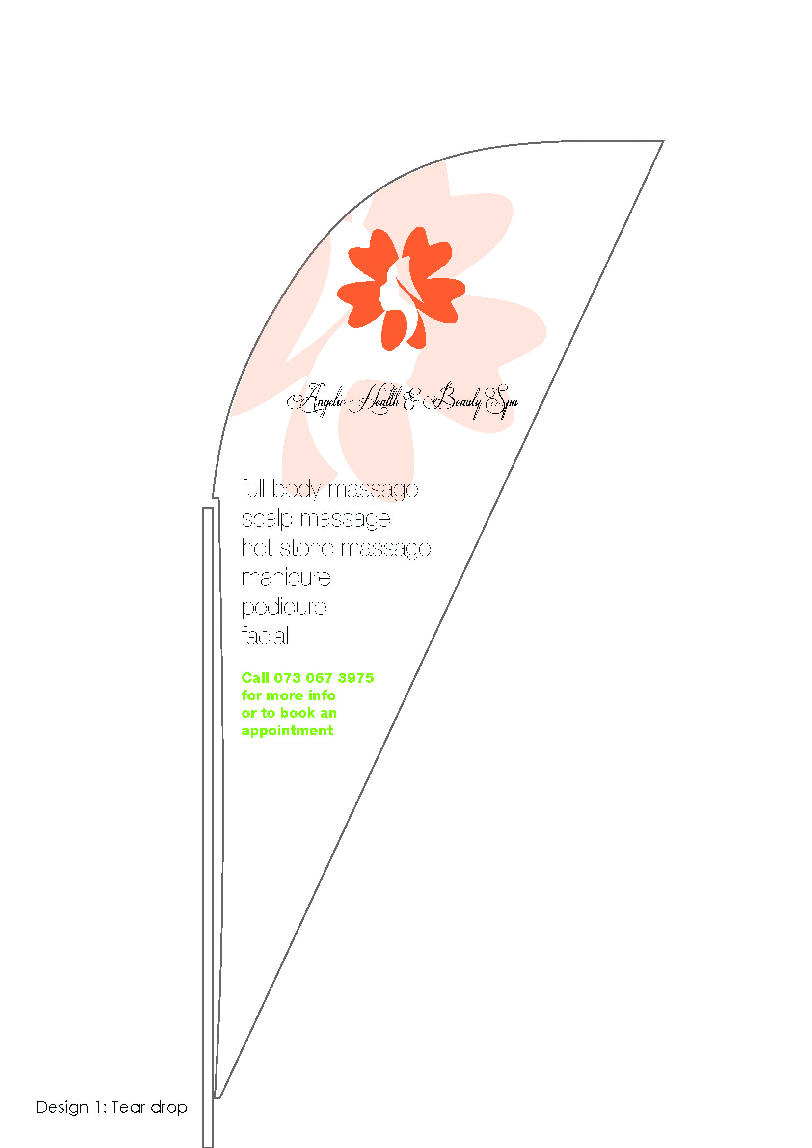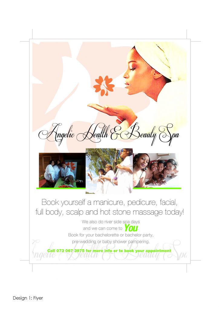 We created a simple look campaign and marketing tool elements for Angelic Beauty and Spa that included a Teardrop, pull-up banner, business card, flyer and client card. The Vanderbijlpark based spa wanted a clean look that is not to complex and retains the logo with all its aspects. Pictures were provided and Bino Tladi delivered the finished products to a happy business owner.